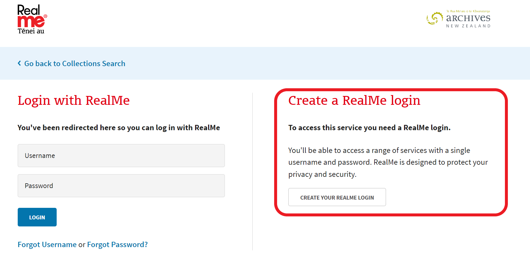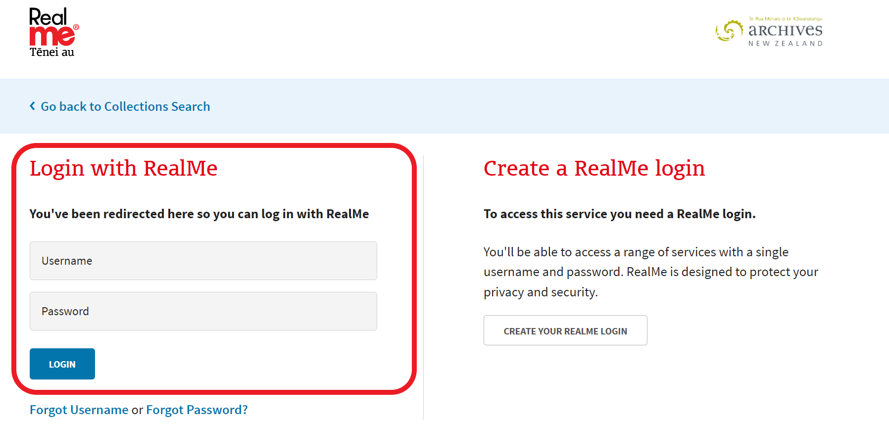To sign up for Collections search, you’ll need a RealMe login. (this will be an unverified account) Using RealMe means we can protect your data and keep Collections search secure.