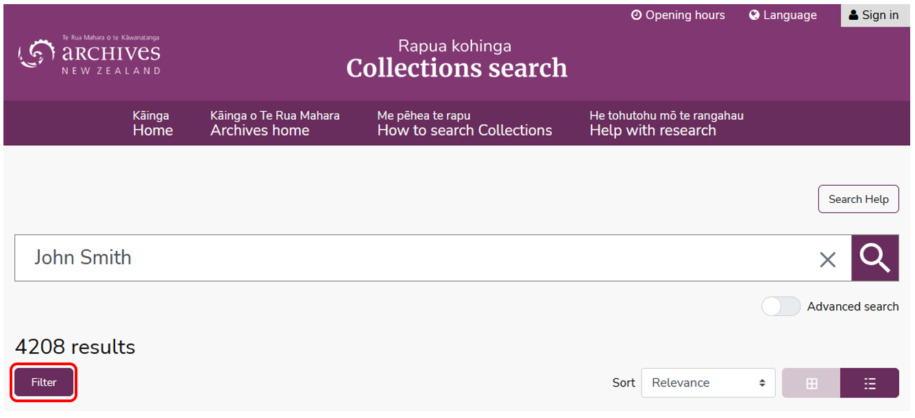 You’ll often get a large number of results if you put names or keywords into Collections search. Use the filters on the search results page to find the most relevant records.